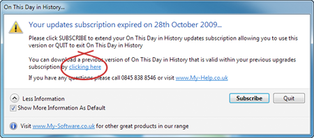 If you do not wish to extend your upgrades & support subscription you can download an older version of our software released during your upgrades & support subscription period by "Clicking Here" as highlighted below, however older versions may not be compatible with the latest Microsoft operating systems therefore it is recommend you extend your subscription: